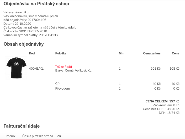 | Příjemce | 1. Pirátská s.r.o. |