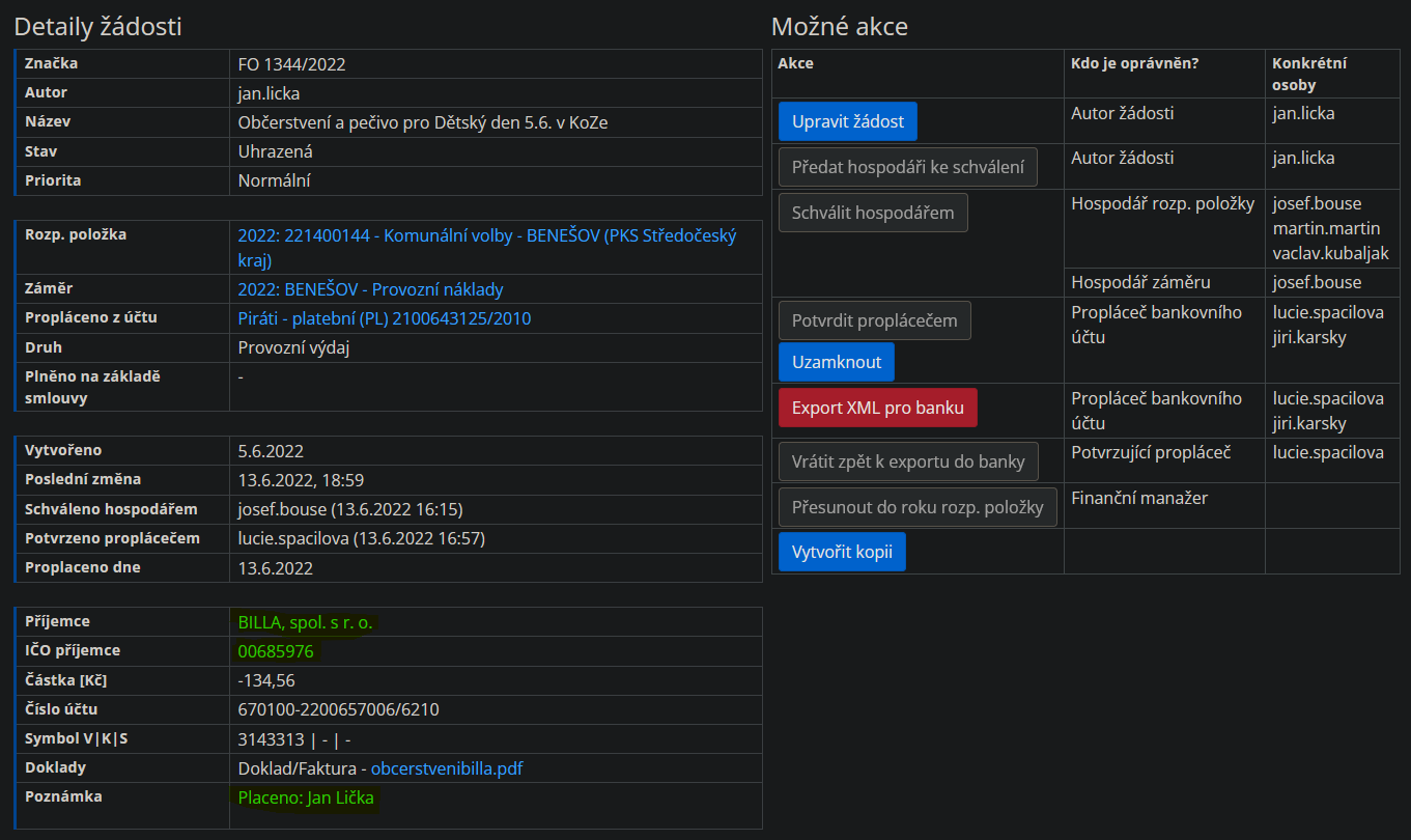 Toto je žádost o proplacení. Na základě žádosti proplácíme z rozpočtu strany členům výdaje, které vynaloží v souvislosti s činností strany a souhlasem orgánů hospodařících s rozpočtem. Odpovídající transakce je dohledatelná na transparentním bankovním účtu strany pod uvedeným datem proplacení a názvem záměru.