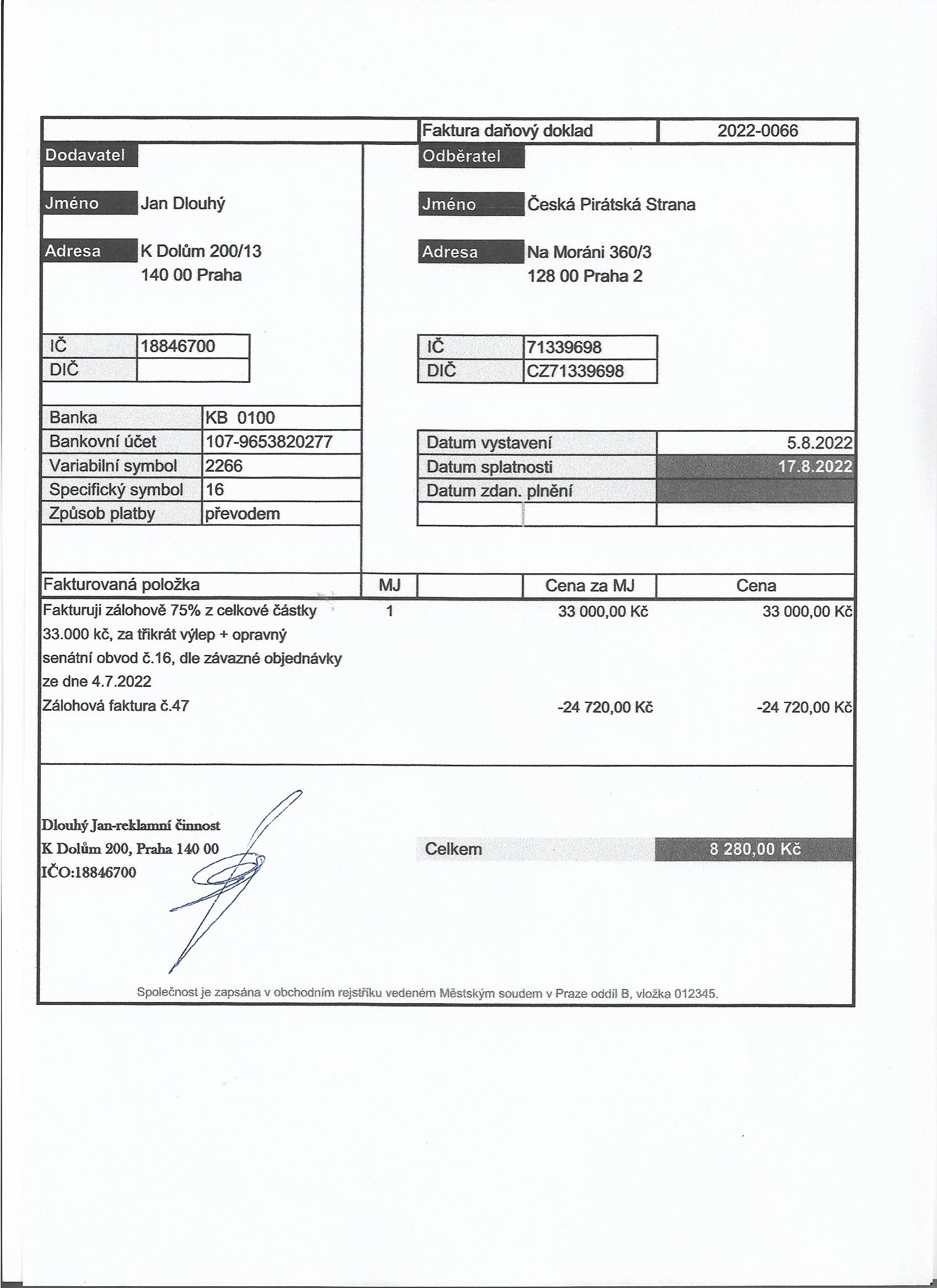 | Poznámka | Faktura k zálohové platbě FO 1987/2022 - Zálohová faktura Senát č. 16 - výlep https://piroplaceni.pirati.cz/zadost/24297/ s doplatkem 8280Kč |
